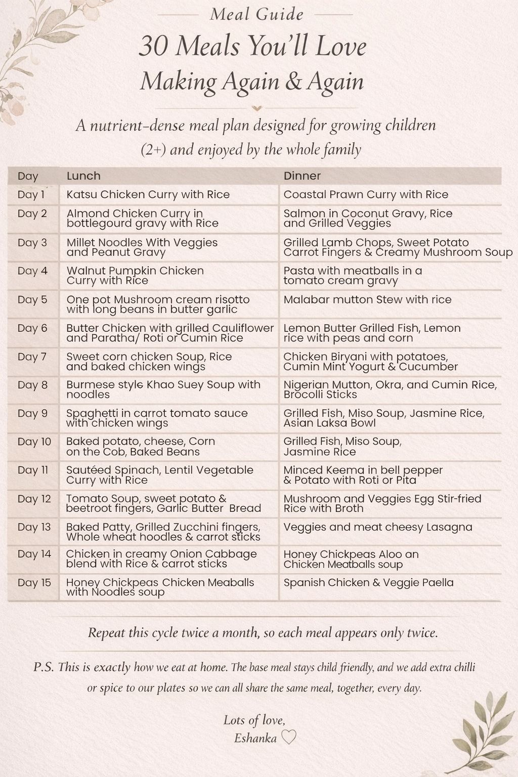 Filled with nutrient-dense, wholesome, and easy-to-follow meals, it includes 30 complete meals (nearly 90 recipes), along with 30 snack ideas and 10 simple breakfast options. A nutrient dense plan for growing children 2 years and above, which can be enjoyed by the whole family.
